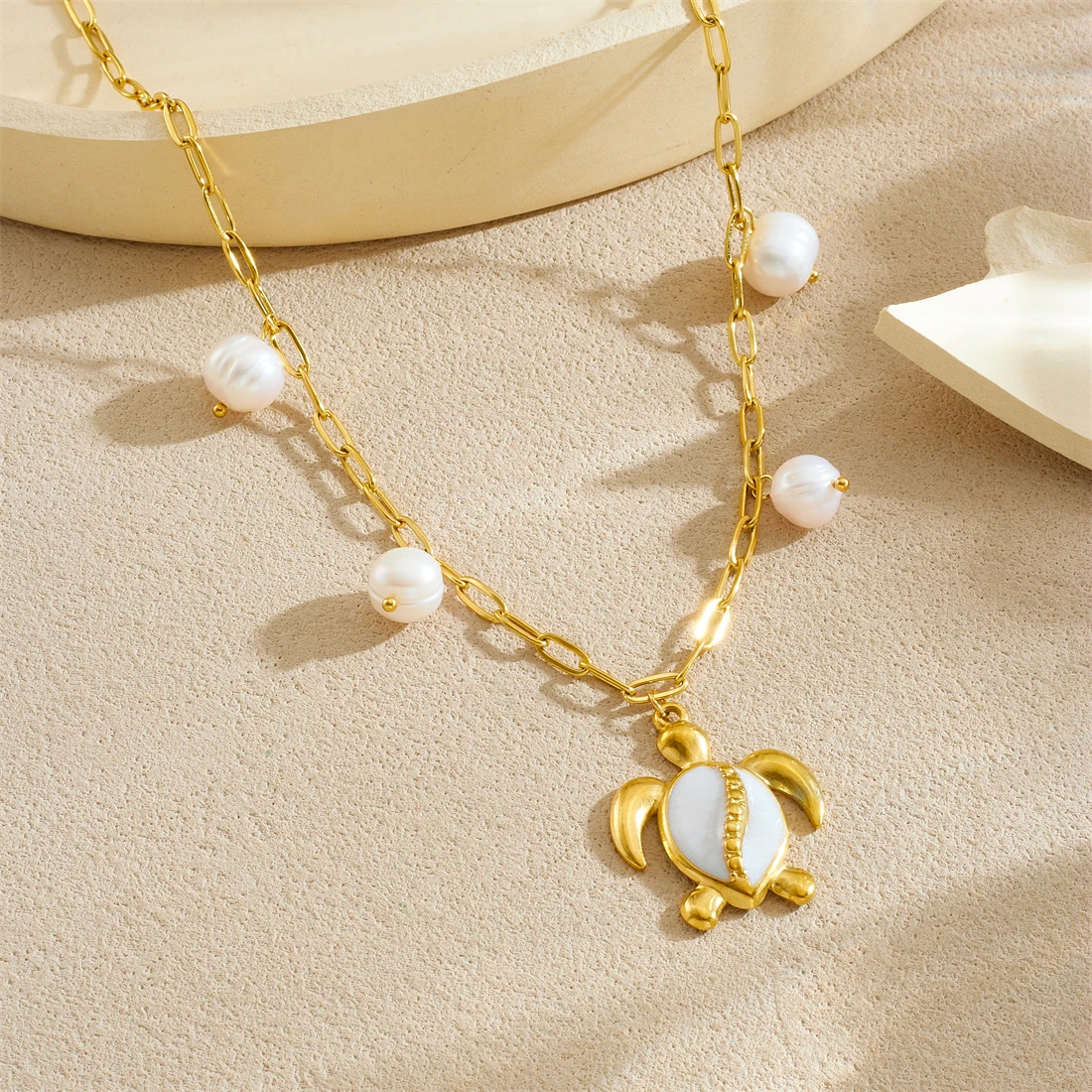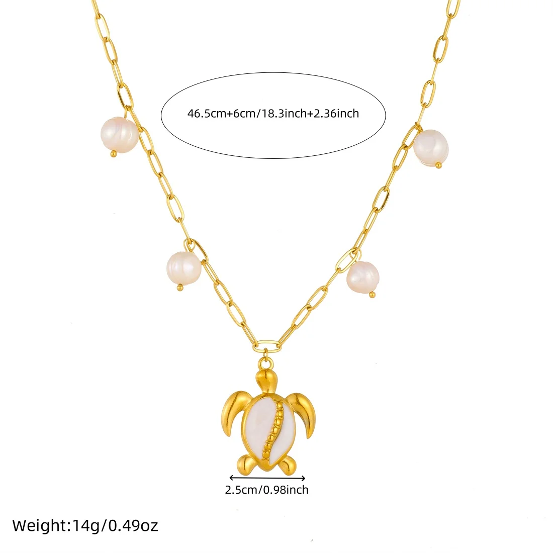 DIEYURO 316L Stainless Steel White Dripping Oil Animal Turtle Pearl Pendant Necklace Lady Fashion Neck Chain Jewelry Gift