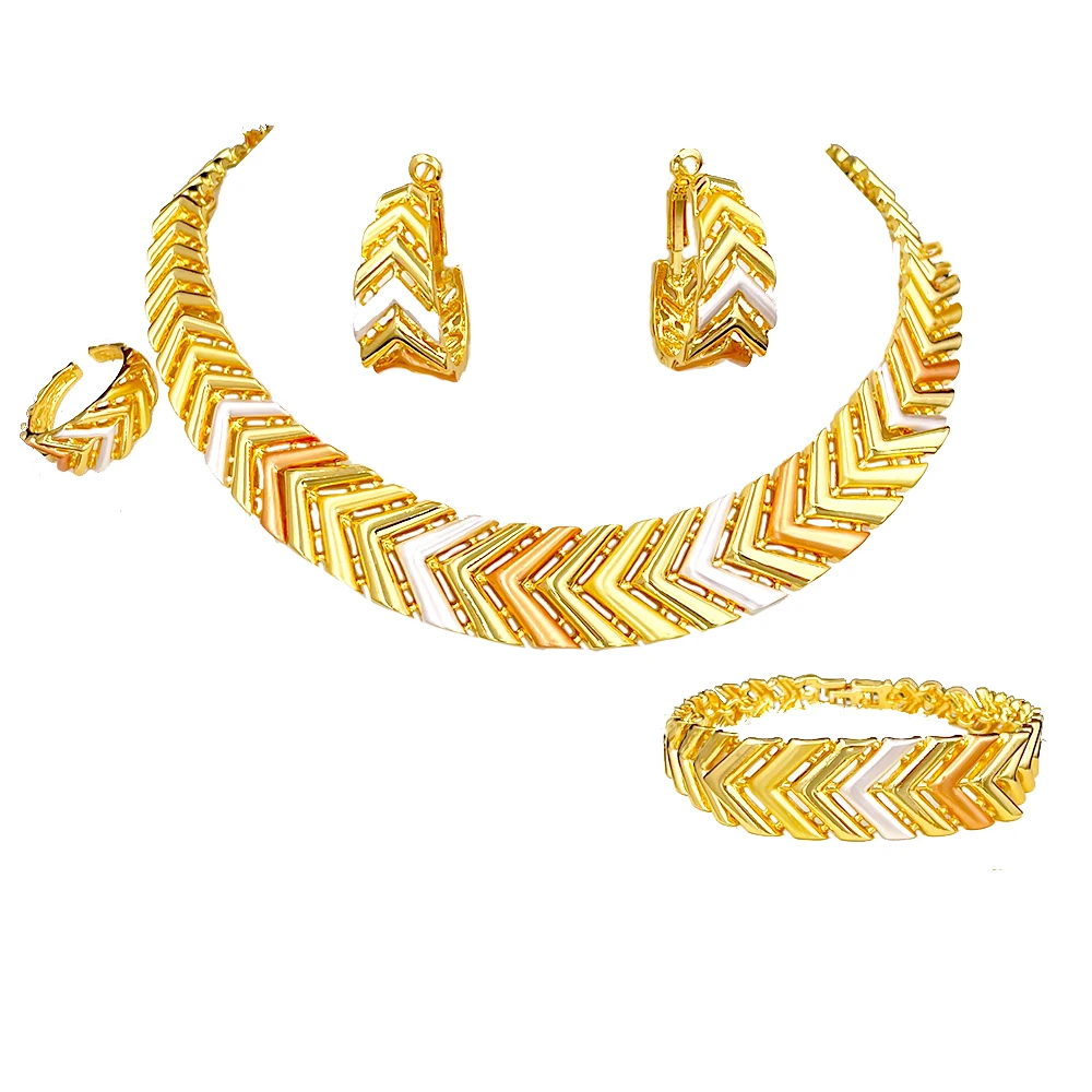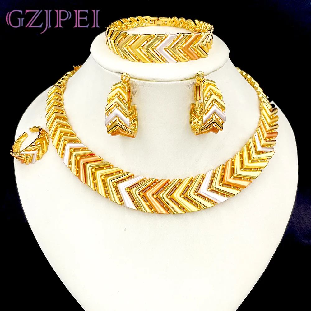 GZJPEI Tricolor Jewelry Set For Nigerian Bridal Wedding Gift Hight Quality 18K Gold Plated Large Necklace Bracelet Earring Ring