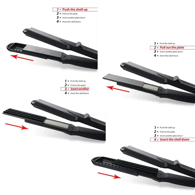 4-in-1 interchangeable plates hair styling tool, contains L wave plate, M wave plate, S wave plate and flat plate.