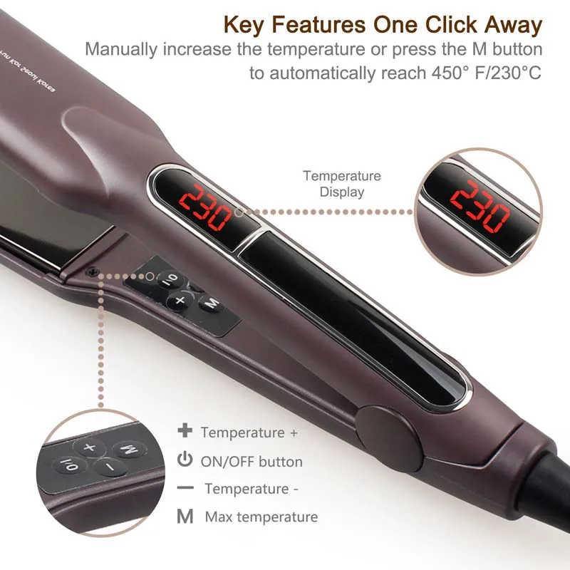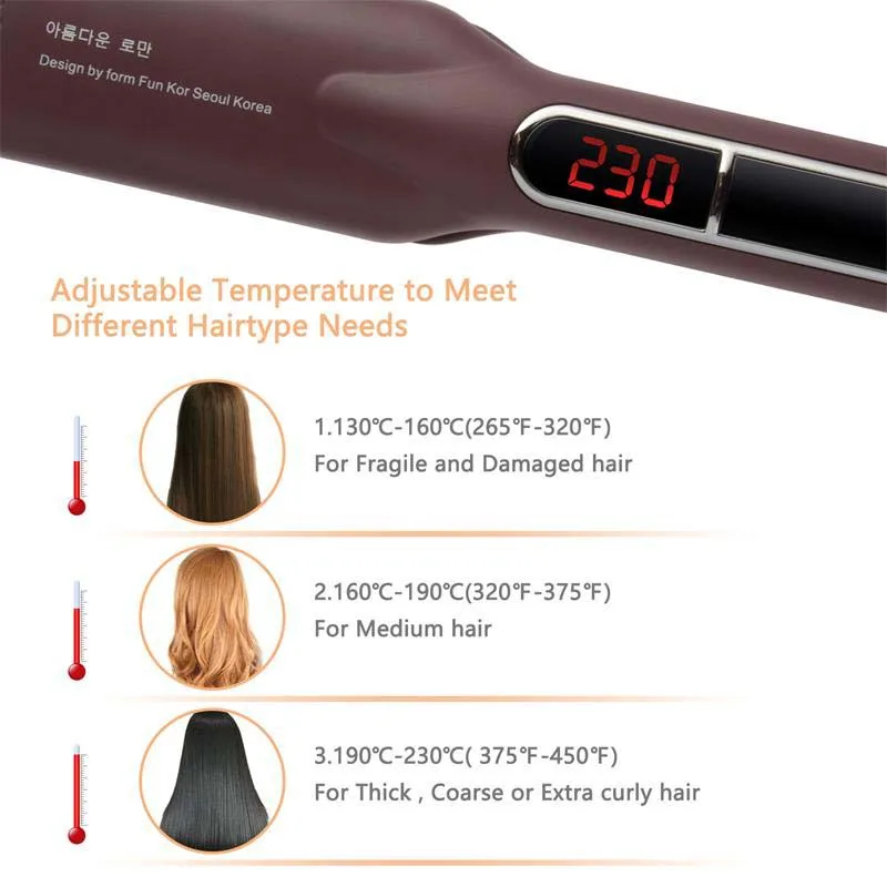 Designed with damage-free 3D Floating hair straightener, avoids pulling or damaging hair while styling, leaving your hair more shiny, sleek, and healthy. The wide plate provides faster straightening, saving your time while creating style.