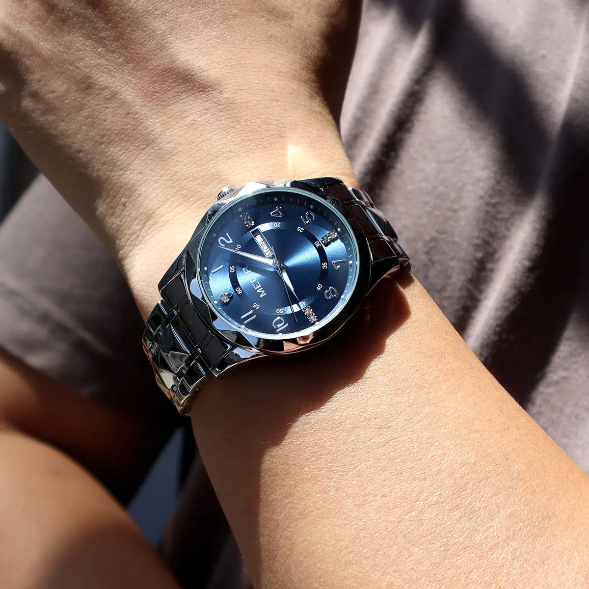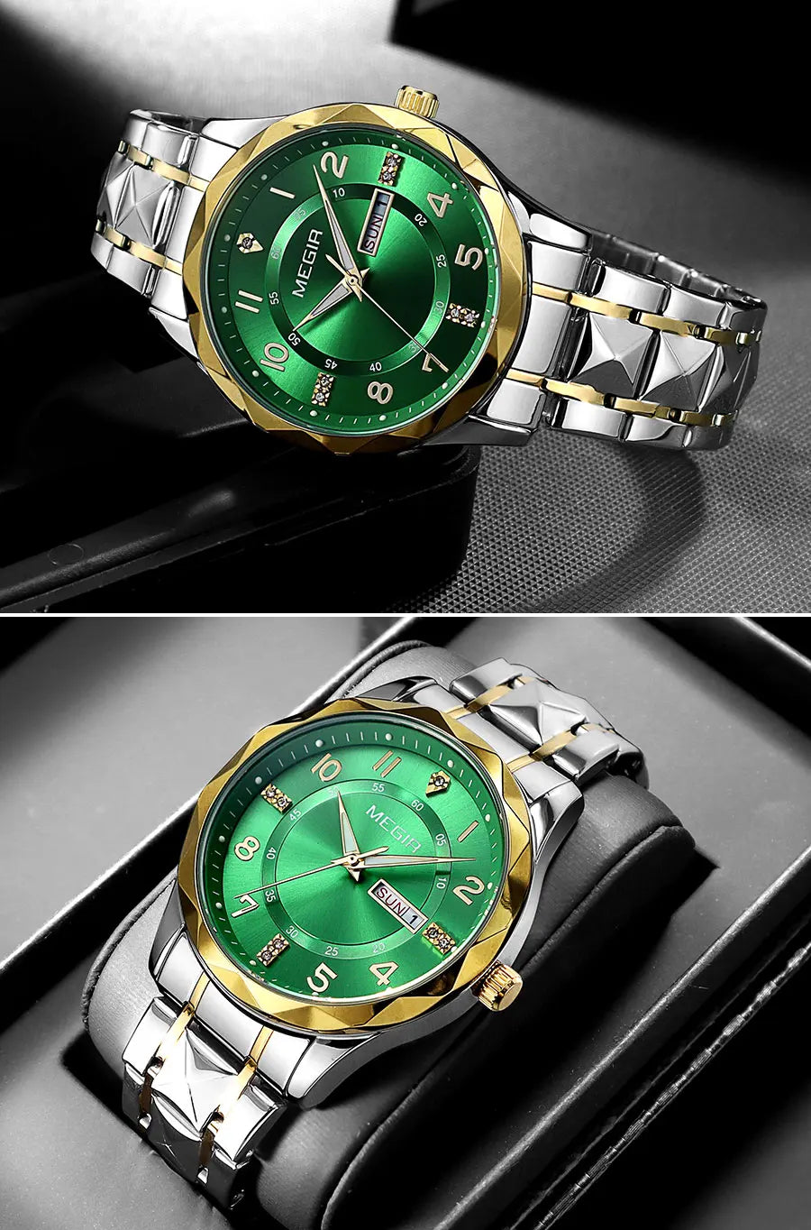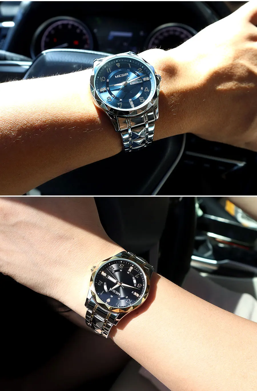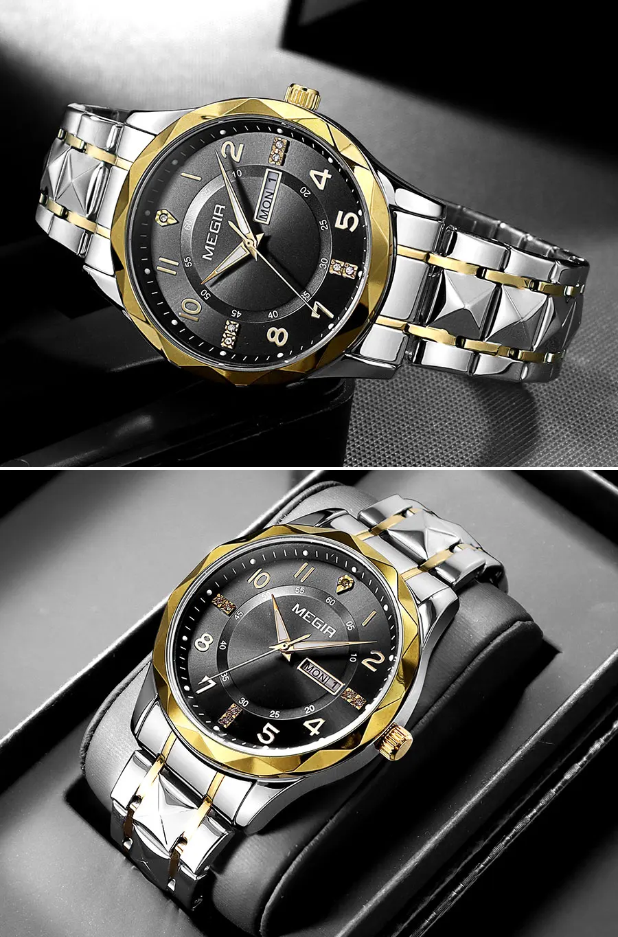 MEGIR Elegant Simple Style Men Quartz Watch with Date Day Display Fashion Stainless Steel Strap Alloy Case Ladies Wristwatch