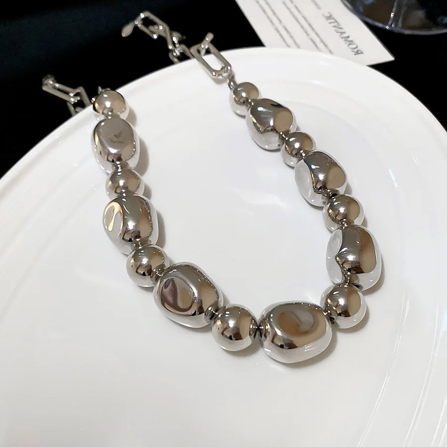 Minar Punk Irregular Metallic ABS Beads Strand Beaded Necklace for Women Silver Plated Metal Alloy Hollow Link Chain Chokers