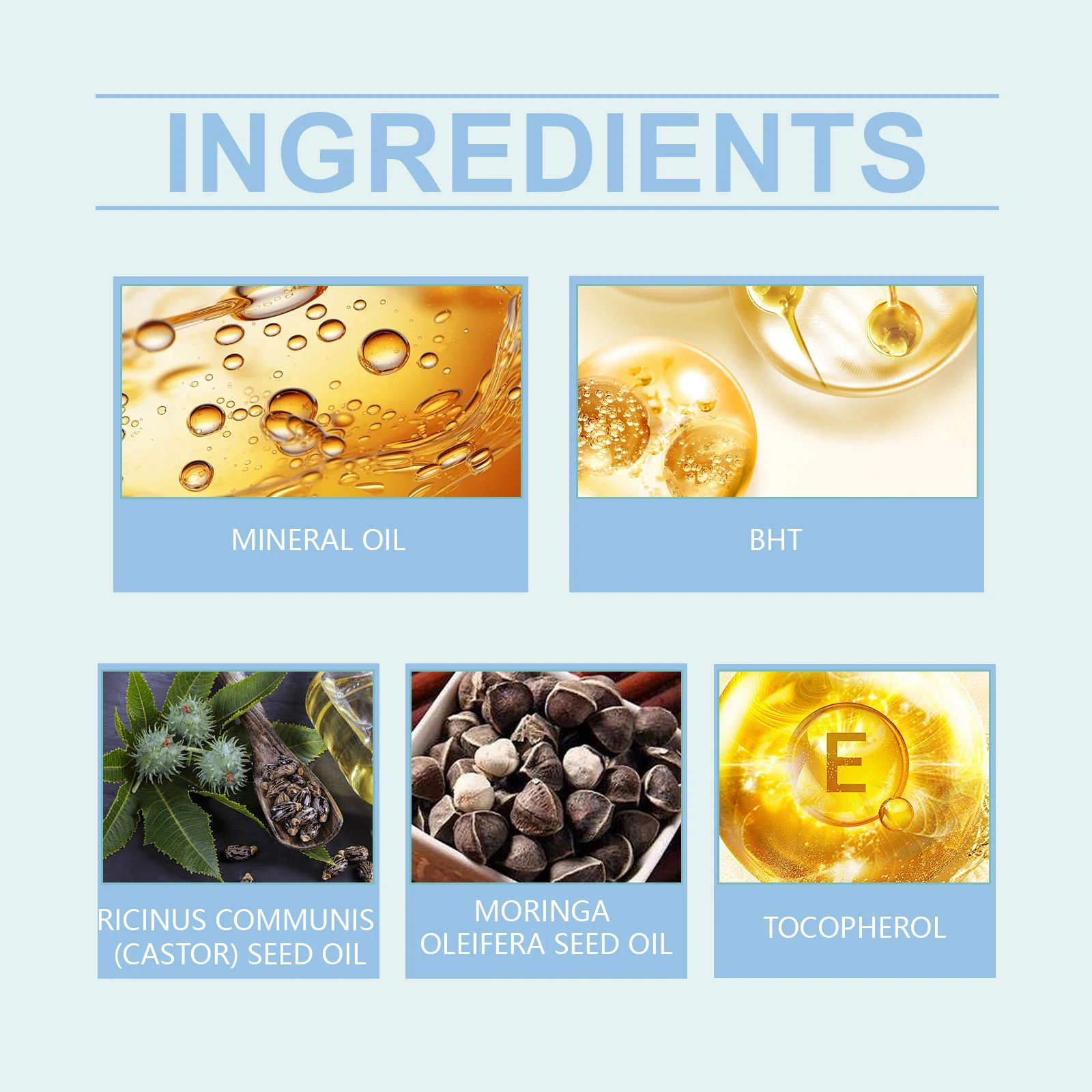 MINERAL OIL、BHT、RICINUS COMMUNIS (CASTOR) SEED OIL、MORINGA OLEIFERA SEED OIL、TOCOPHEROL