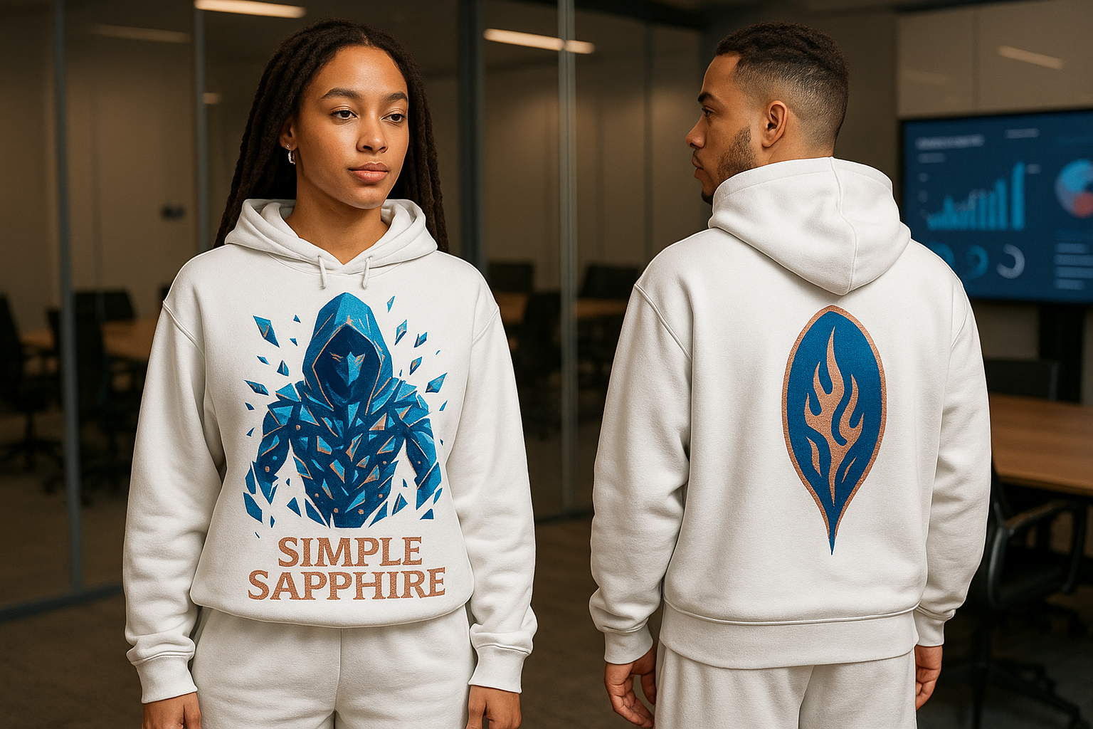 - Front: Sapphire Hooded Figure with "Simple Sapphire branding