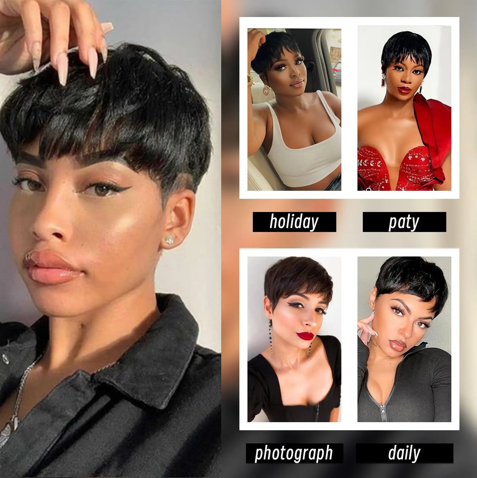 Embrace bold, modern style with our pixie cut human hair wig. This 6-inch short wig features full machine-made construction, natural black color, glueless design, and layered straight styling for effortless chic.