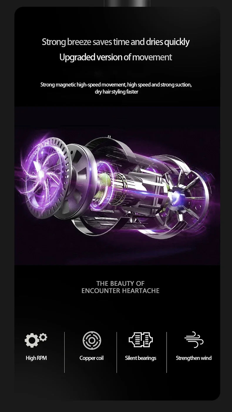 - Design features include a quiet, brushless motor operating at 9800rpm/sec for a comfortable, noise-reduced blow-drying experience — ideal for home, salon, or travel use.