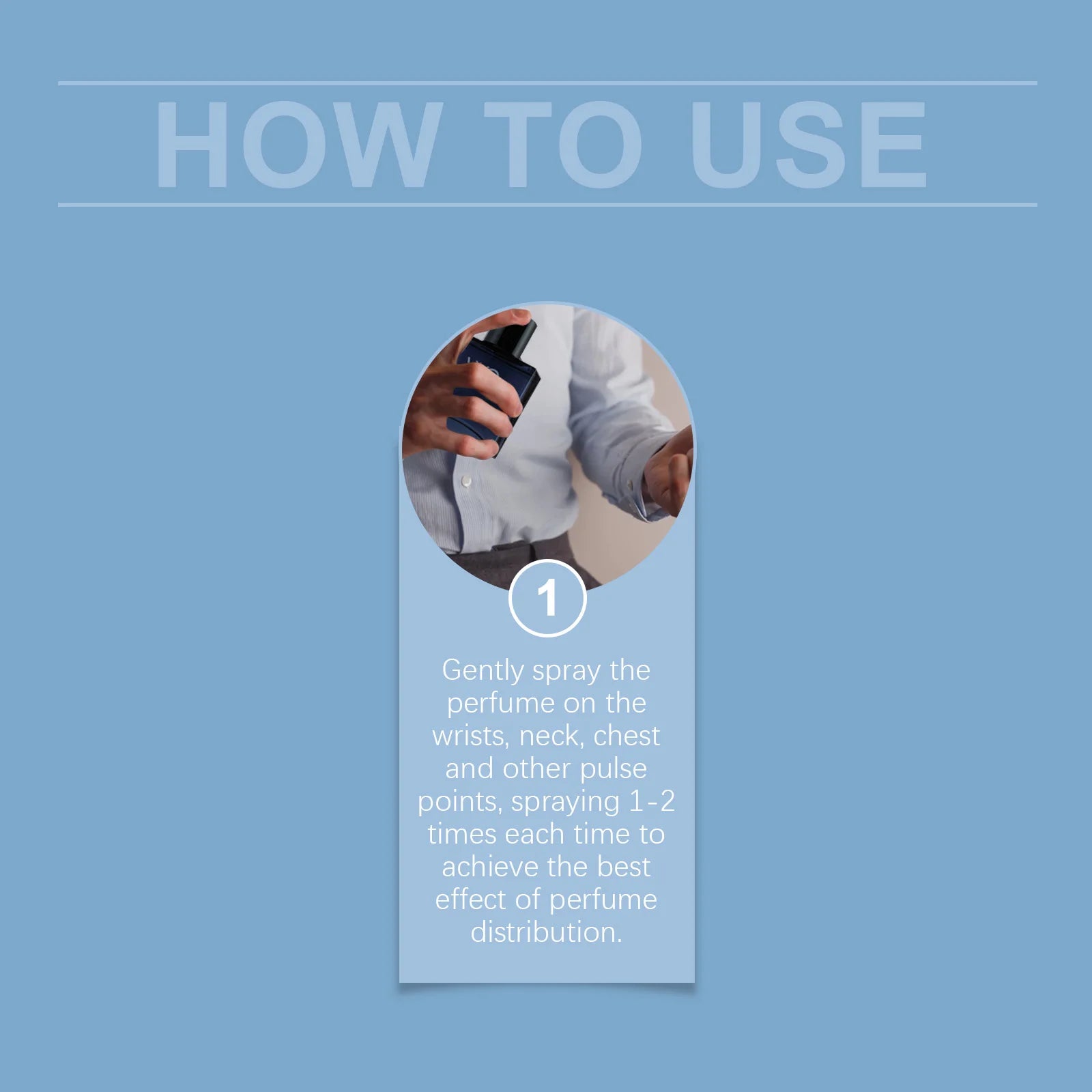 Gently spray the perfume on the wrists, neck, chest and other pulse points, spraying 1-2 times each time to achieve the best effect of perfume distribution.